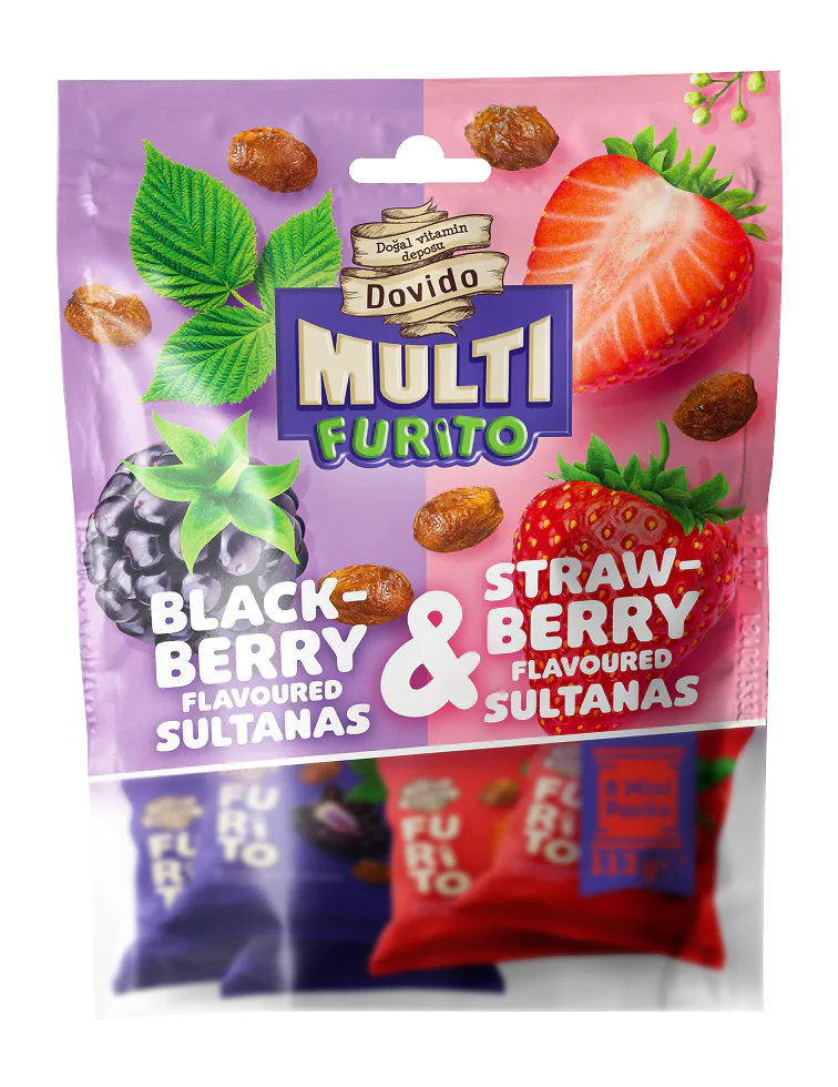 Doğal üzüm tanelerinin çilek ve böğürtlen aromasıyla buluştuğu Dovido Furito, hem çocuklar hem de yetişkinler için keyifli ve sağlıklı bir atıştırmalık alternatifi sunar. C vitamini açısından zengin yapısıyla güçlü bir antioksidan kaynağıdır; bağışıklığı destekler, ağız ve cilt sağlığının korunmasına yardımcı olur. Lif deposu olması sayesinde sindirimi düzenler, potasyum içeriğiyle de gün boyu enerji sağlar. Koruyucu ve renklendirici içermeyen Multi Furito Çilek & Böğürtlen Aromalı Kuru Üzüm, günün her anında güvenle tüketebileceğiniz lezzetli bir vitamin deposudur.